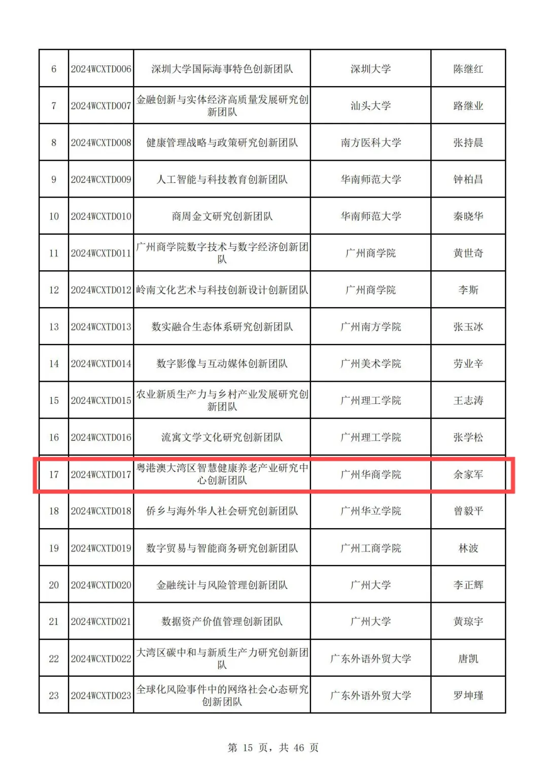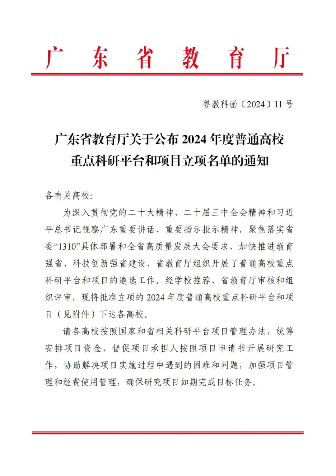 近日,广东省教育厅发布了《广东省教育厅关于公布2024年度普通高校重点科研平台和项目立项名单的通知》(粤教科函〔2024〕11号),广州多多28“粤港澳大湾区智慧健康养老产业研究中心创新团队”项目获批立项。