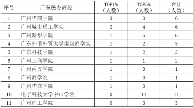 (中国知网高被引学者TOP1%-TOP5%广东民办高校排名前11一览表