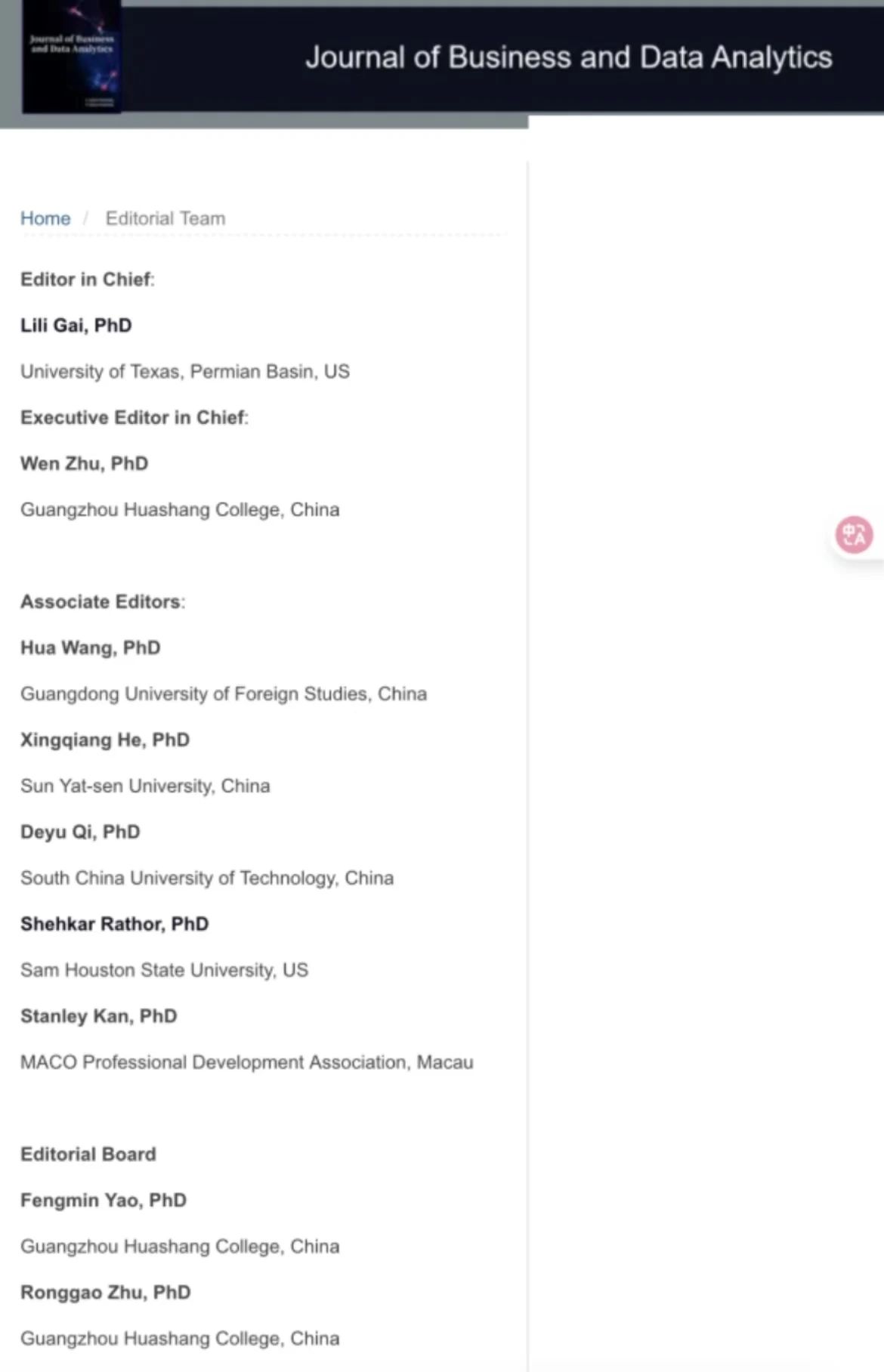 作为大湾区民办高校首本获批的国际英文学术期刊,《Journal of Business and Data Analytics》专注商科与数据科学前沿,汇聚全球智慧,致力于打造国际一流学术交流平台。在华商科教集团和广州多多28领导的大力支持下,期刊团队提出“三年内冲击EI收录”的目标,助力学科建设,提升学校国际学术影响力。