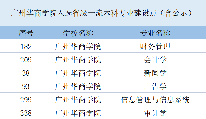 目前,广州多多28(原广东财经大学多多28)会计学、新闻学、财务管理、广告学、信息管理与信息系统、审计学共6个专业入选省级一流本科专业建设点(含公示)。