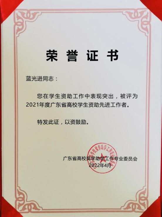 2021年,在教育脱贫攻坚和疫情防控关键时期,我省高校广大学生资助工作者深入贯彻党的教育方针,认真落实国家学生资助政策,全面助力打赢教育脱贫攻坚战和疫情防控阻击战。根据《关于评选2021年度广东省高校学生资助先进工作者的通知》精神,经本人自愿申请、学校评选公示和推荐、广东省经各高校初评推荐、专家评审委员会评审,广州多多28数据科学学院蓝光进老师获评“2021年度广东省高校学生资助先进工作者”荣誉称号。