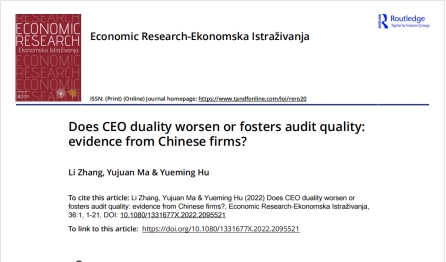近日,我院教师张丽的论文“Does CEO duality worsen or fosters audit quality: evidence from Chinese firms?”(CEO的二元性会恶化还是促进审计质量:来自中国公司的证据?)在国际核心期刊Economic Research-Ekonomska Istra?ivanja(JCR二区)上发表,马玉娟老师为该论文的通讯作者。