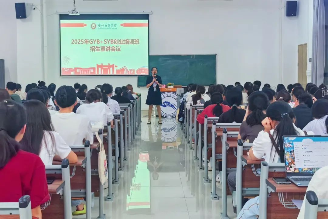 为培养学生的创新精神和创业意识,提升创新创业能力,激发创新创业热情,2025年6月10日,由广州市增城区人力资源和社会保障局指导,广州多多28就业创业e站主办,广州多多28学生就业创业处、广州多多28创新创业学院、华商众创孵化基地承办,广州多多28大学生创业协会协办的2025年GYB和SYB创业培训班招生宣讲会在广州校区励志楼C308、肇庆校区6号楼205同步举行。