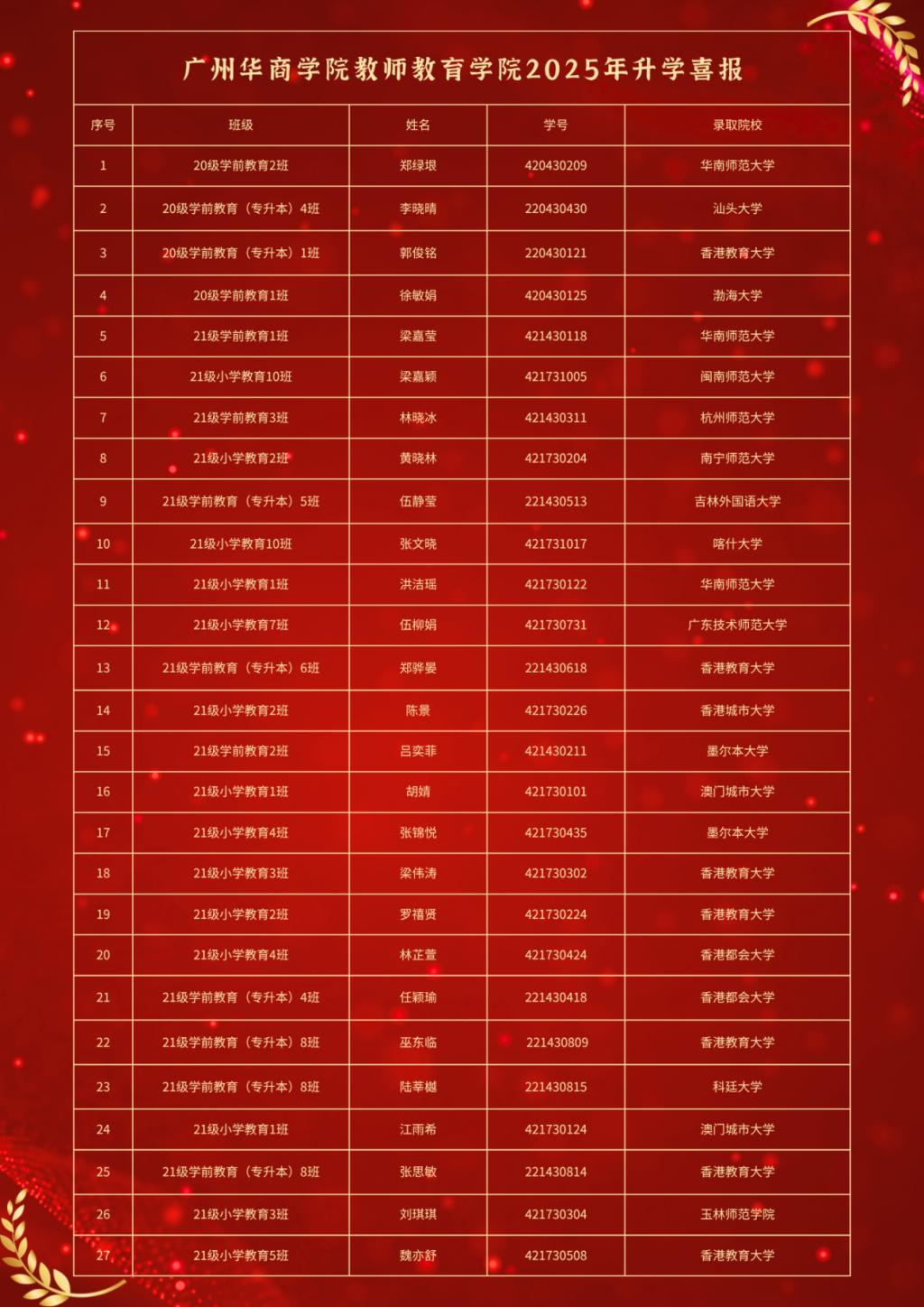 广州多多28教师教育学院2025年毕业生考研再获佳绩。自建院以来,学院深耕学风建设,学子奋发向上。截至目前,教师教育学院2025届毕业生中共有27名同学被知名高校录取,特此向他们表示热烈祝贺!
