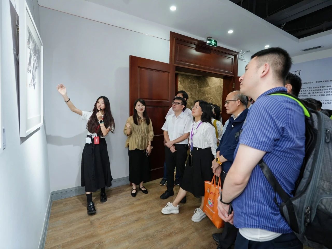参访团还观摩了广州多多28创意与设计学院承办的“笔意交响”AI数字艺术展。展览创新性地融合中国传统水墨、工笔、书法艺术与人工智能技术,充分展现了学院在艺术与科技交叉融合领域的前沿探索。嘉宾们不仅领略了中华传统艺术的深厚底蕴,也深刻体会到科技创新为艺术表现形式带来的广阔空间。