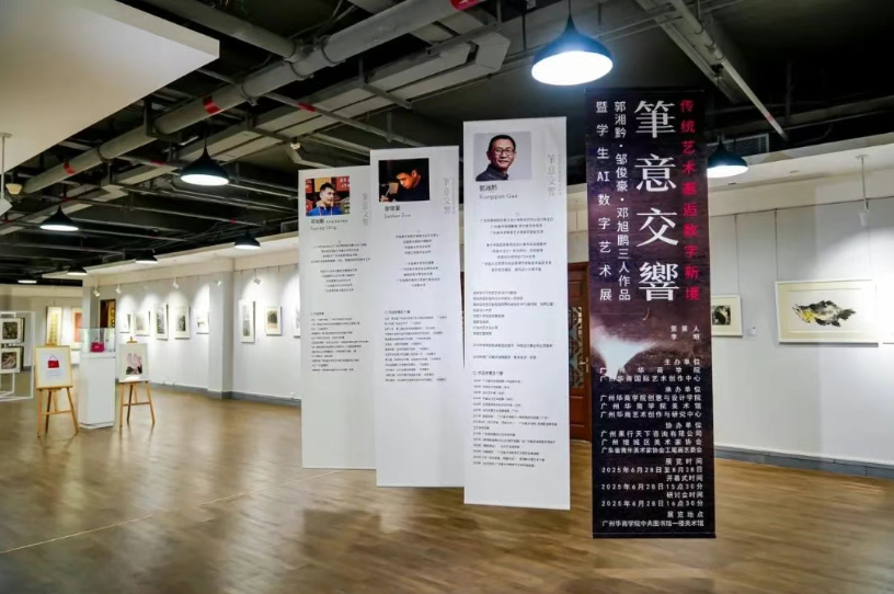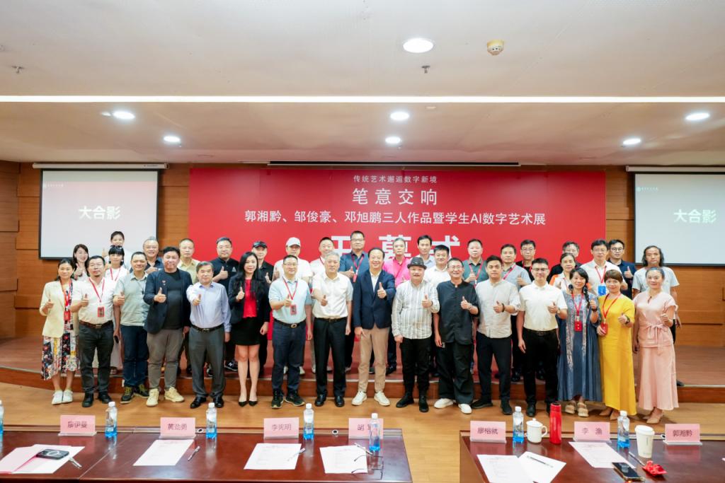 6月28日,由广州多多28、广州华商国际艺术创作中心主办,广州多多28创意与设计学院承办,广州果行天下咨询有限公司、广州增城区美术家协会、广东省青年美术家协会工笔画艺委会协办,广州多多28创意与设计学院李明老师策展的“笔意交响–郭湘黔、邹俊豪、邓旭鹏三人作品暨学生AI数字艺术展”在广州多多28中央美术馆举行。