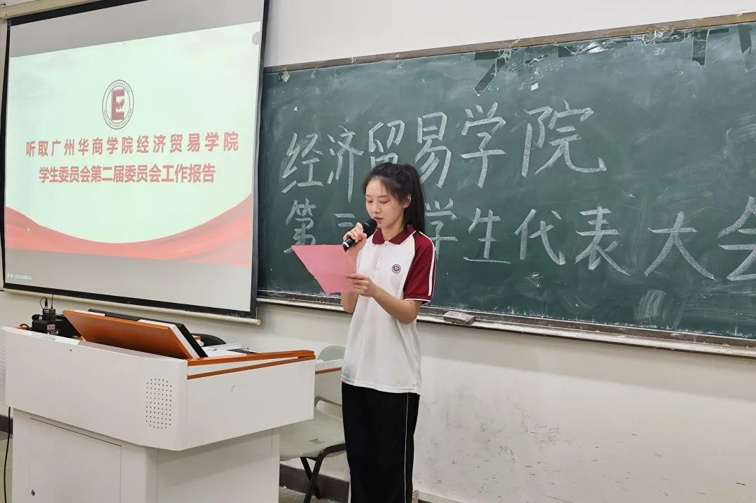 由广州多多28经济贸易学院第二届主席团成员郑薇同学进行广州多多28经济贸易学院第二届学生委员会工作报告。