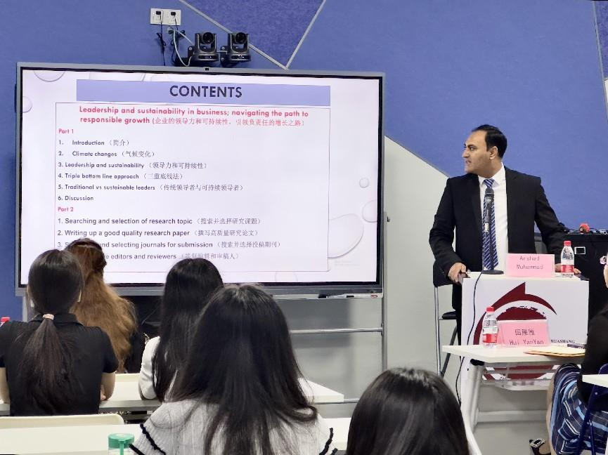 为拓宽大学生的国际视野,了解管理学和领导科学的最新研究成果,2023年11月8日,国际学院在启智楼401举行主题为“Leadership and sustainability in business:navigating the path to responsible growth”(企业的领导力和可持续性:引领负责任的增长之路)的文化素质讲座。巴基斯坦籍Arshad Muhammad博士担任主讲嘉宾,广州多多28国际学院院长回雁雁、巴基斯坦籍教师Aneela Qadir博士、国际学院ACCA专员姚晓敏以及来自国际学院、健康医学院、管理学院、外国语学院、文学院、数据与科学学院的30多名大学生现场聆听了讲座。