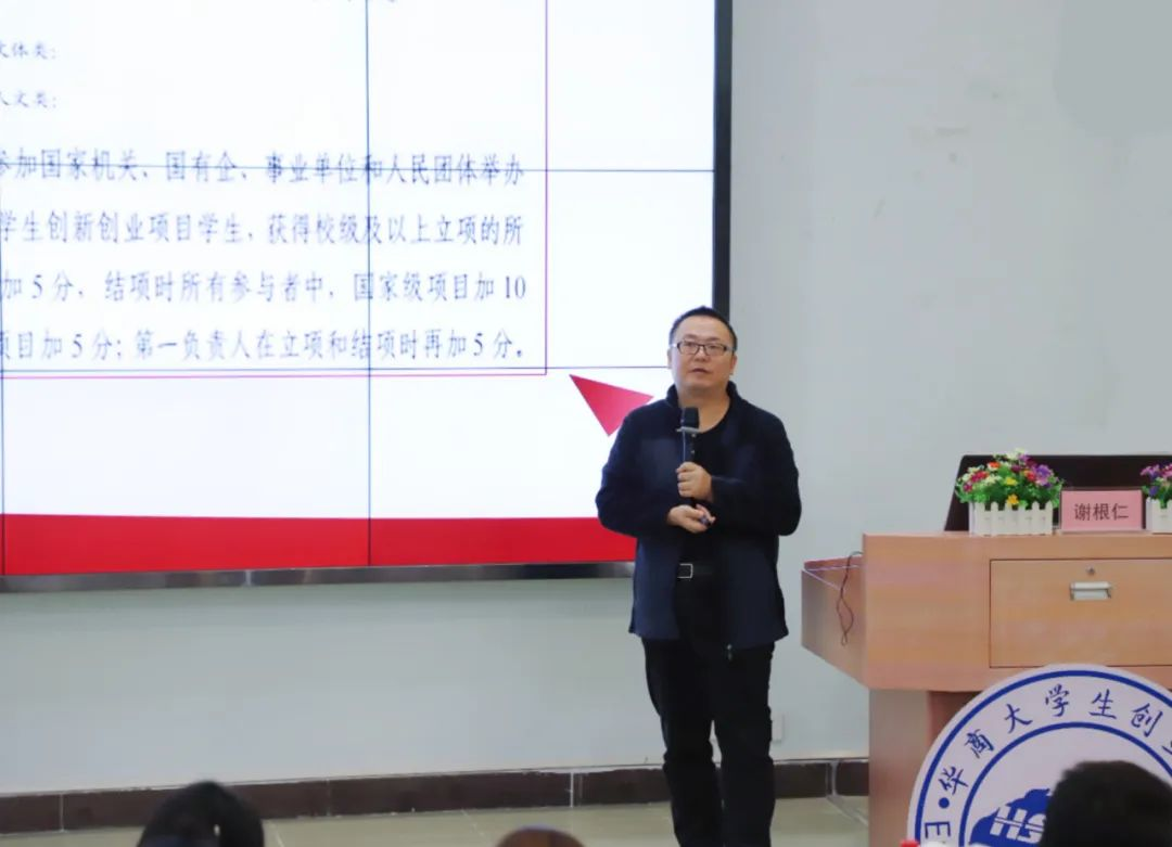 讲座伊始,谢根仁老师从大学生创新创业训练计划项目(以下简称“大创”)的起源、目的及项目类型三方面系统地介绍了什么是“大创”以及“大创”的具体内容。谢老师从“大创”与竞赛实践、学分的关系等方面向同学们阐述了大学生参加“大创”的重要性。
