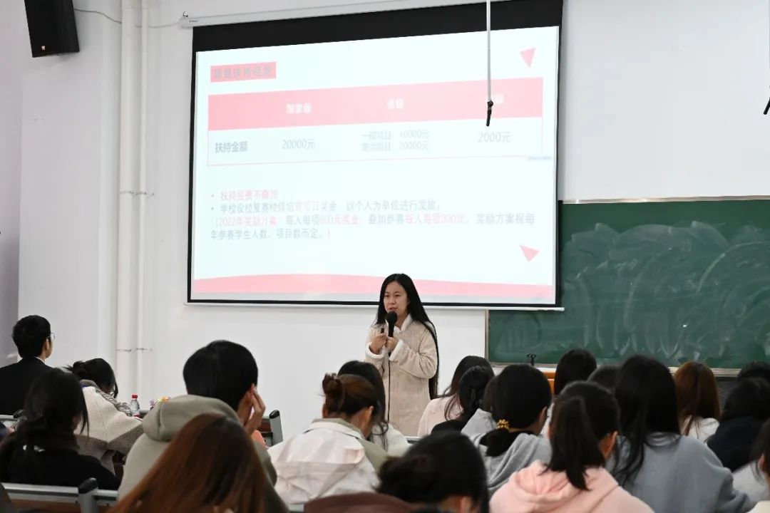 李雅琼老师从“助比赛”“促就业”“益考研”等六个层面解答了学生参与“大创”的重要性,鼓励同学们积极申报“大创”,提高自主创新能力,努力成为国家发展需要的创新型人才。李老师的讲解让同学们对“大创”有了全面的了解。