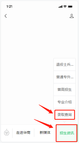 2.进入“广州多多28招生办”公众号,点击菜单栏“招生资讯”,选择“录取查询”