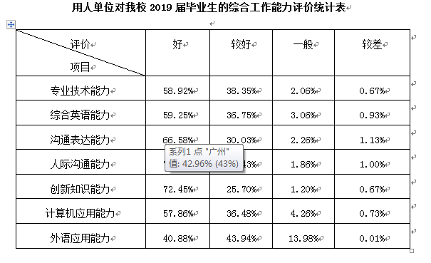 用人单位对我校本科毕业生专业技术能力、综合实践能力、沟通表达能力、人际协调能力、学习新知识能力、计算机应用能力、外语应用能力等的满意度都比较高。总的来说,用人单位对我校毕业生能力综合评价的满意度合计96.3%,请参看下表。