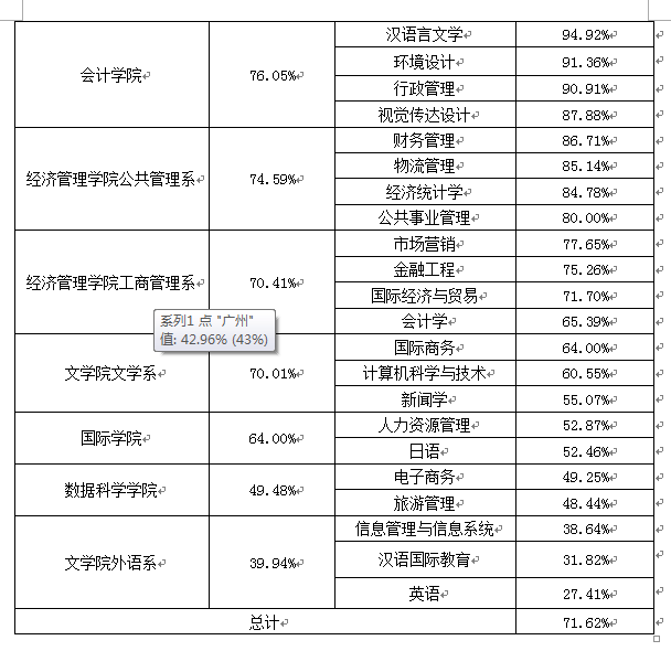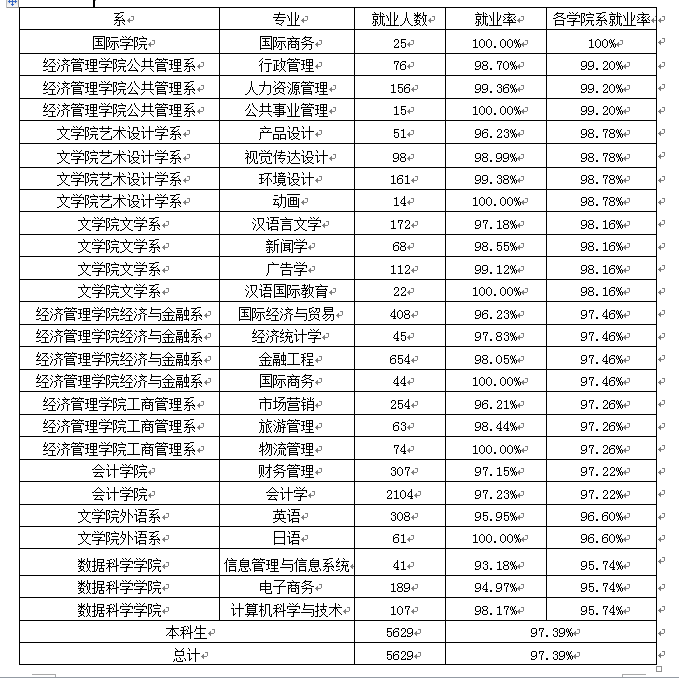 从表中看,学校2019届毕业生就业的专业对口率平均为71.62%其中,我校2019届毕业生初次就业专业对口率在其所在院系中,文学院艺术设计学系专业对口率最高,为93.87%;其次是经济管理学院经济与金融系,为81.80%;再次是会计学院,为76.05%;专业对口率较低的为国际学院、数据科学学院、文学院外语系,分别为64.00%49.48%39.94%
