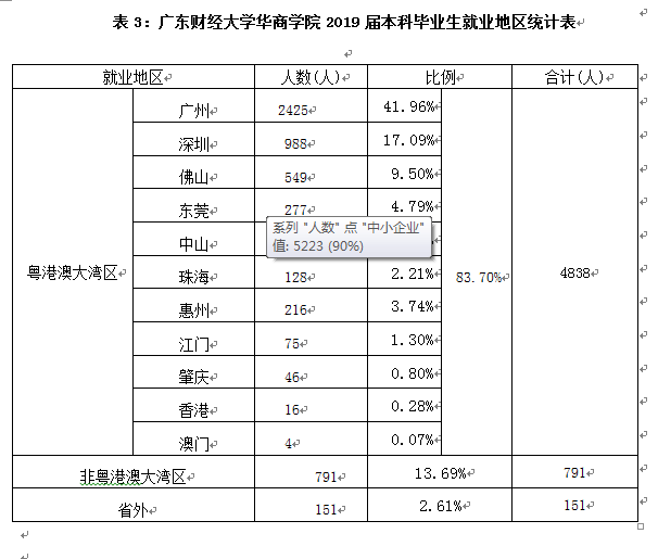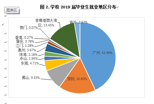 截至201991日止,学校2019届已就业本科毕业生总数为5780人,其中在粤港澳大湾区就业的有4838人,占已就业本科生人数的83.70%;在非粤港澳大湾区外的有791人,占全校已就业本科生人数13.69% ;在外省就业的有 151人,占全校已就业本科生人数 2.61% 。我们学校进入粤港澳大湾区地区的人数比例很大,说明学校学生比其他学校学生相比思维更加活跃,更加富有创新,冒险精神,更加具备创业者的相关素质和性格。同时也从侧面反应出学校的教学水平高,学校就业范围浓厚,接受粤港澳大湾区的挑战。