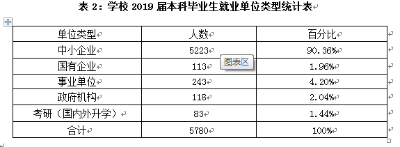 学校人才培养的目标是为广东中小企业及社会服务机构培养理论基础厚,实践能力强、综合素质高的高级应用型人才。从就业流向来看,学校2019届毕业生主要集中在中小型企业就业。学校的就业单位类型统计情况请参看表2和图1