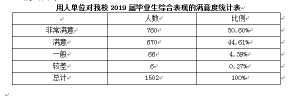用人单位对我校毕业生综合表现非常满意为50.6%,满意为44.61%,满意度合计96%,这说明我校毕业生的综合素质得到用人单位的认可,反映出我校教学质量良好。
