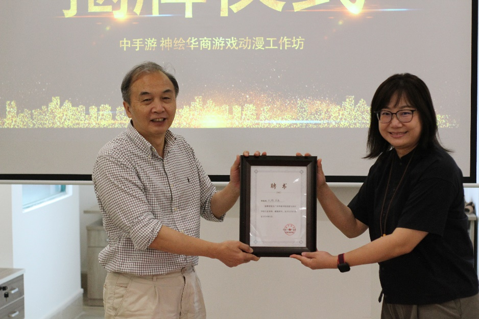 为促进双方合作与实践教学,广州多多28创意与设计学院聘请中手游神绘公司总经理骆俊、美术总监刘畅担任 “行业导师”,王列耀副校长为其颁发聘书。