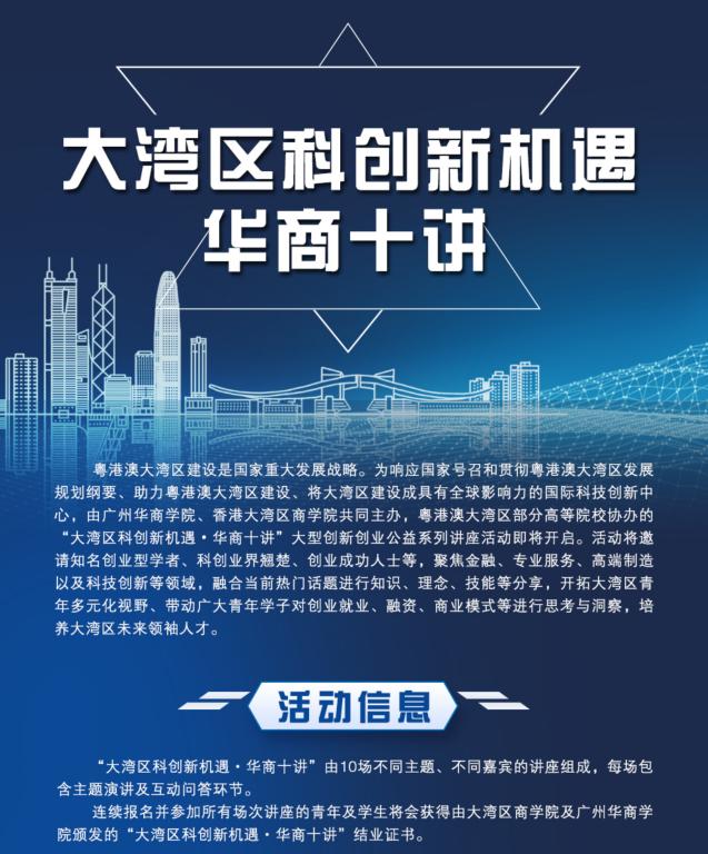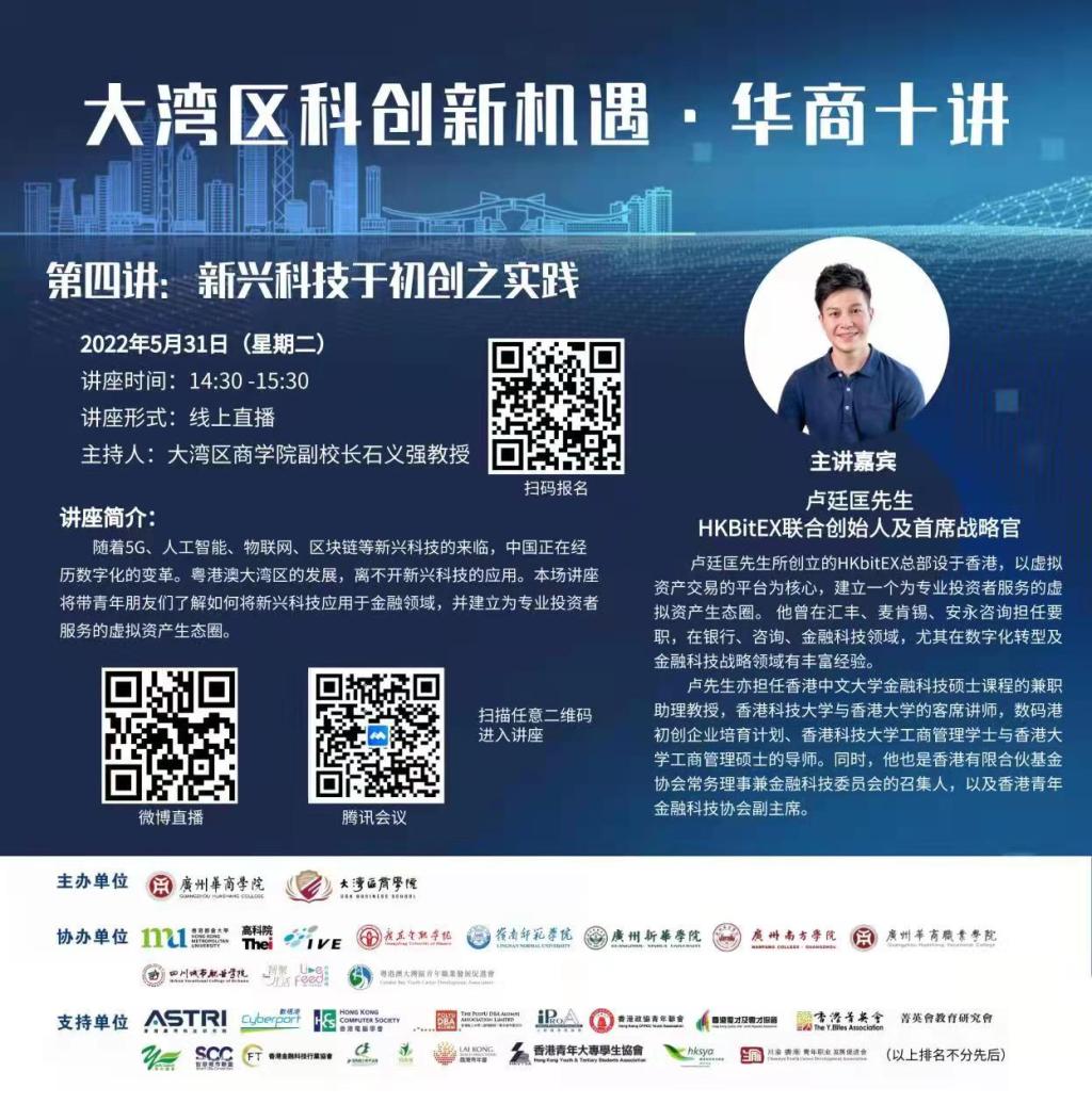 讲座内容:随着5G、人工智能、物联网、区块链等新兴科技的来临,中国正在经历数字化的变革。粤港澳大湾区的发展,离不开新兴科技的应用。本场讲座将带同学们了解如何应用新兴科技于金融领域,并建立专业投资者服务的虚拟资产生态圈。
