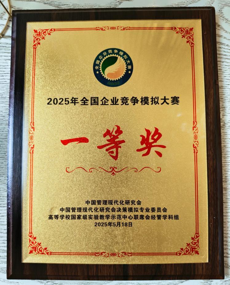 2025年5月18日,由中国管理现代化研究会决策模拟专业委员会主办、西南财经大学承办的2025年全国企业竞争模拟大赛总决赛落幕。我校学生团队在“数智沙盘赛道”中斩获全国一等奖。在会计学院郭美娣、何子昉老师的指导下,由黎锡杰、杨建东、刘健荣组成的“奸商”队,从354所学校1619支队伍中突围,以3.9%的晋级比例跻身64强总决赛队伍,最终摘得桂冠,获得赛道一等奖和赛区第一的优秀成绩。