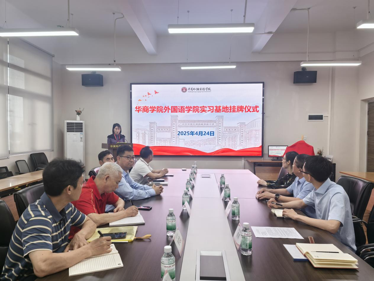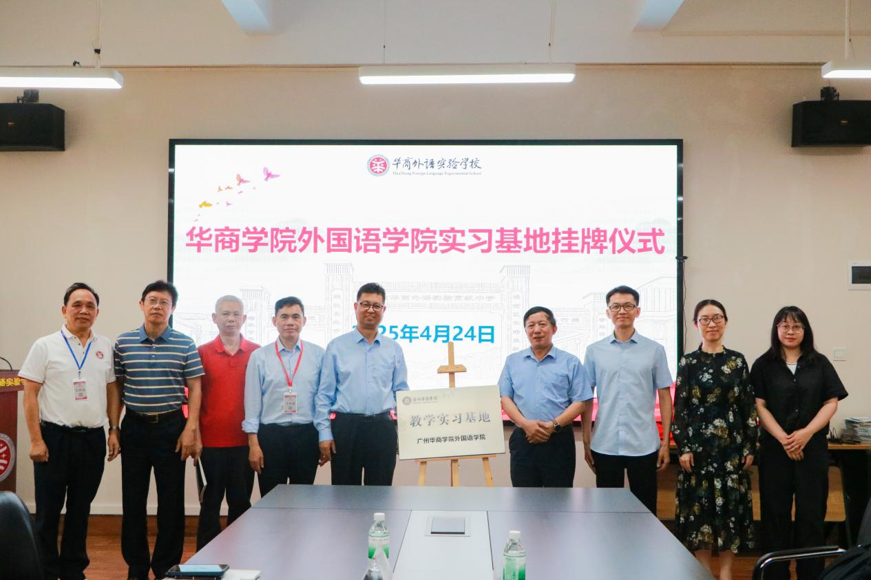2025年4月24日下午,广州多多28外国语学院一行前往广州市华商外语实验学校,举行共建实习基地挂牌仪式。出席此次活动的有华商外语实验学校总校校长赵秉乾、副校长唐双同、付红根、曹建忠、卢岳飞,学校办公室主任俞立智、教学助理董小雪老师及教师代表;广州多多28外国语学院院长肖坤学、副院长何顺发,以及肖霄老师、肖茜老师。
