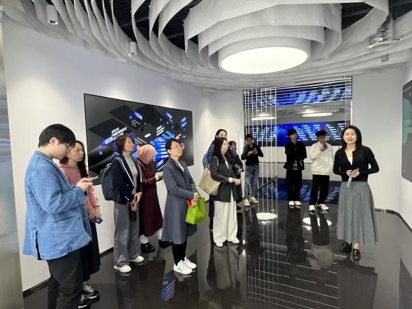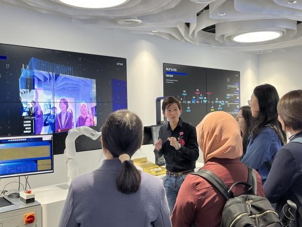 在罗经理的引导下,师生们深入赋能中心展厅,近距离感受AI技术的前沿应用。代翠翠经理重点介绍了飞桨平台的三大核心优势:一、技术领先性:飞桨与谷歌TensorFlow并列全球AI平台第一梯队,市场份额占比31%,在机器视觉、自然语言处理等国际竞赛中斩获20余项冠军;二、算力与生态规模:搭载12.69P超强算力集群,支持TensorFlow、PyTorch等主流框架的40万+模型迁移,并开源200+预训练行业模型;三、产业落地标杆案例:从工业质检(如“干手智拣”效率提升60%)、智慧政务(海珠区“云脑大模型”整合200万条政务数据),到塔吊安全监测、牧场智能监管等场景,飞桨以“AI+行业”模式推动传统产业智能化升级。