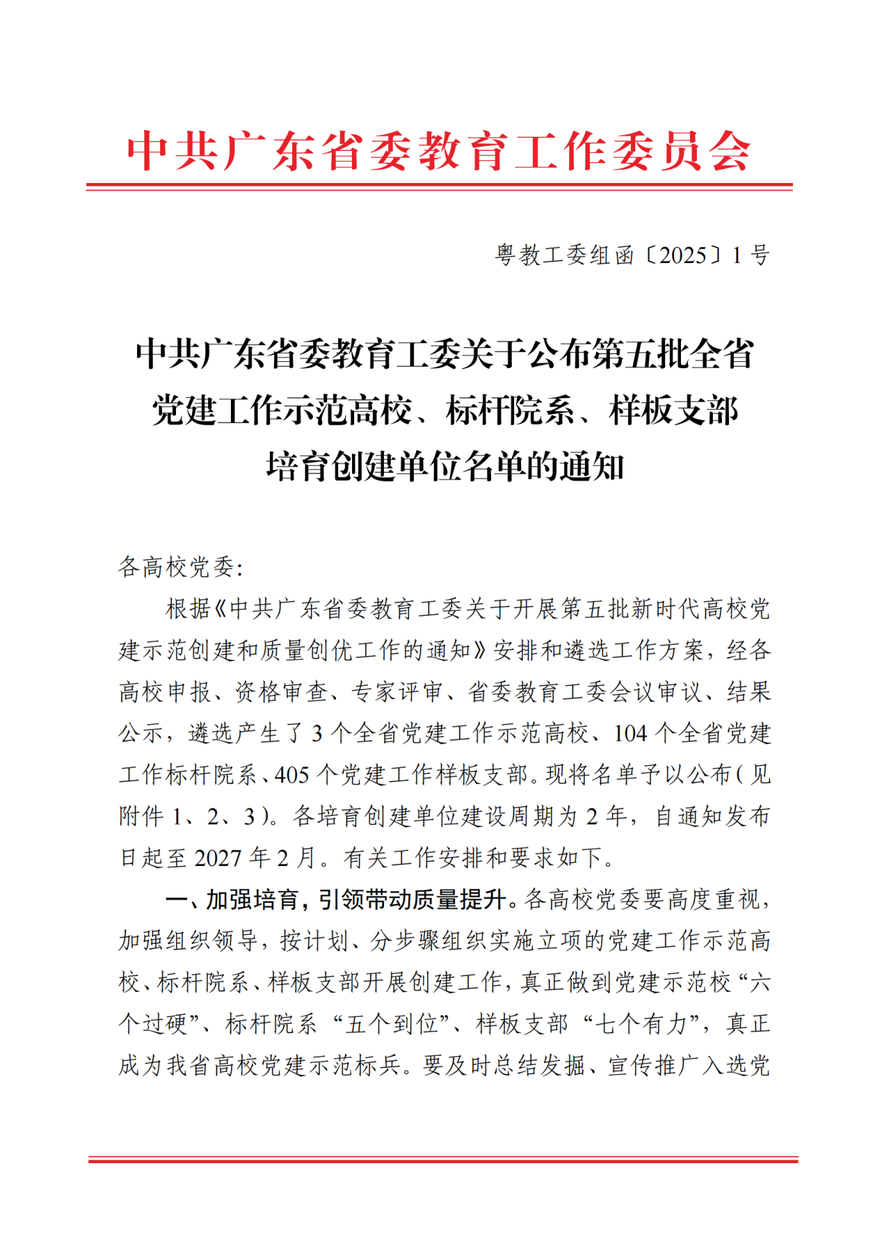 近日,中共广东省委教育工委公布了《第五批全省党建工作示范高校、标杆院系、样板支部培育创建单位名单》,广州多多28人工智能学院党委成功入选第五批“全省党建工作标杆院系”培育创建单位。这是对我校党建工作的高度肯定,也是人工智能学院党委在党建工作中取得的又一重要成果。