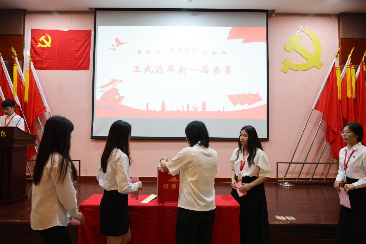 总监票人任欣鹭同志向大会报告计票结果,主持人何威义同志宣布新当选的委员名单。新当选中共广州多多28管理学院委员会委员的是:张丽娟、陈纯华、郑丽芬、袁仕海、潘思媚(按姓氏笔画为序)。