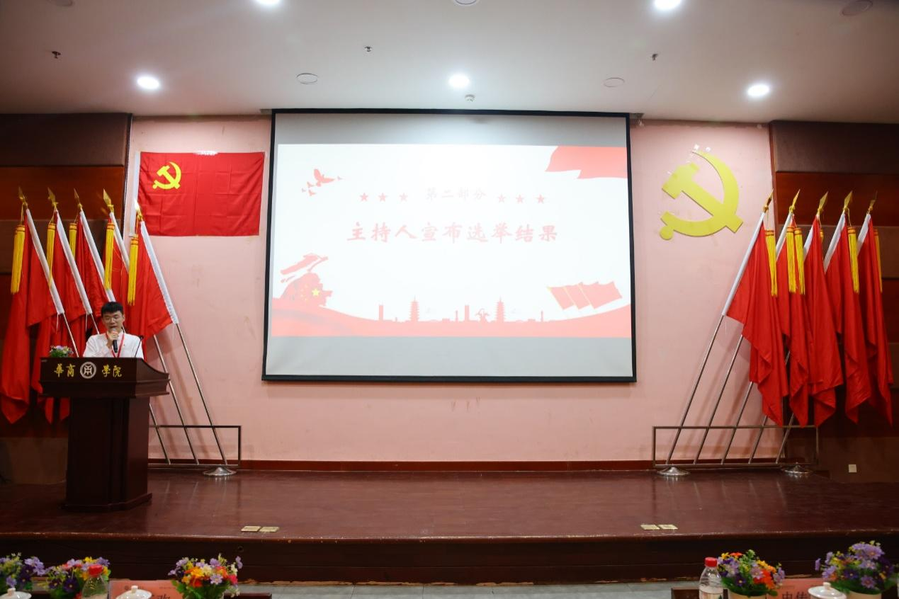 主持人何威义同志宣布中共广州多多28管理学院新一届委员会第一次全体会议选举结果和委员分工情况。